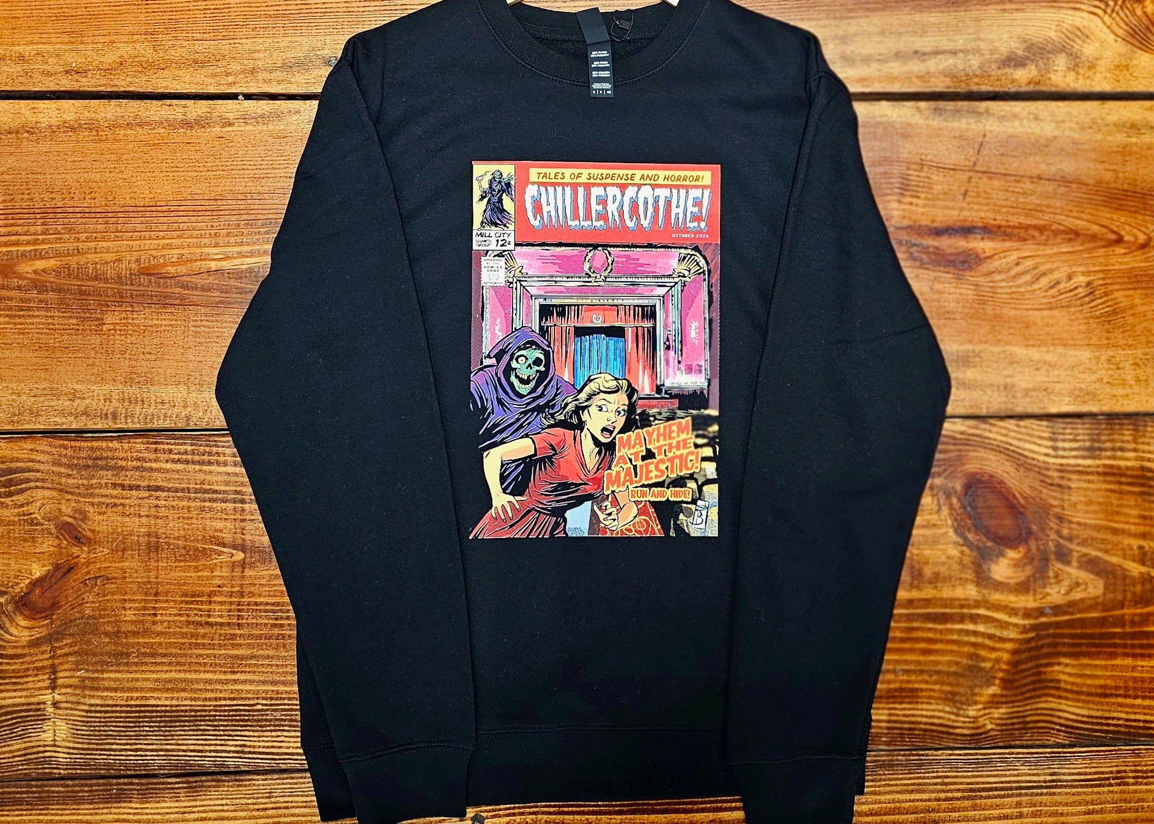 This crew neck sweatshirt comes with the front cover art for this year's Chillercothe comic.