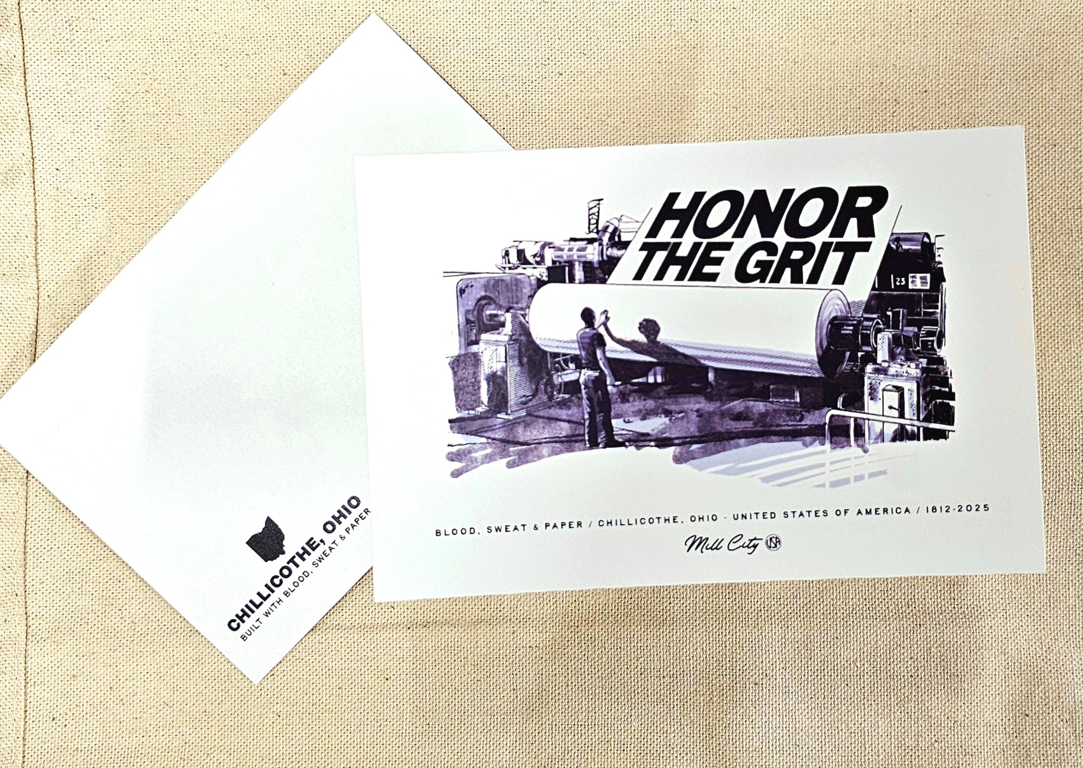 We honor the grit that generations of families dedicated to keeping our town smelling like money from 1873-2025. This postcard measured 4" x 6" and depicts paper winders on the 23 machine formerly found inside the famous Chillicothe Paper Mill. The blood, sweat, and paper given by the men & women of The Mill cannot be summed up in one postcard. Collect them all.