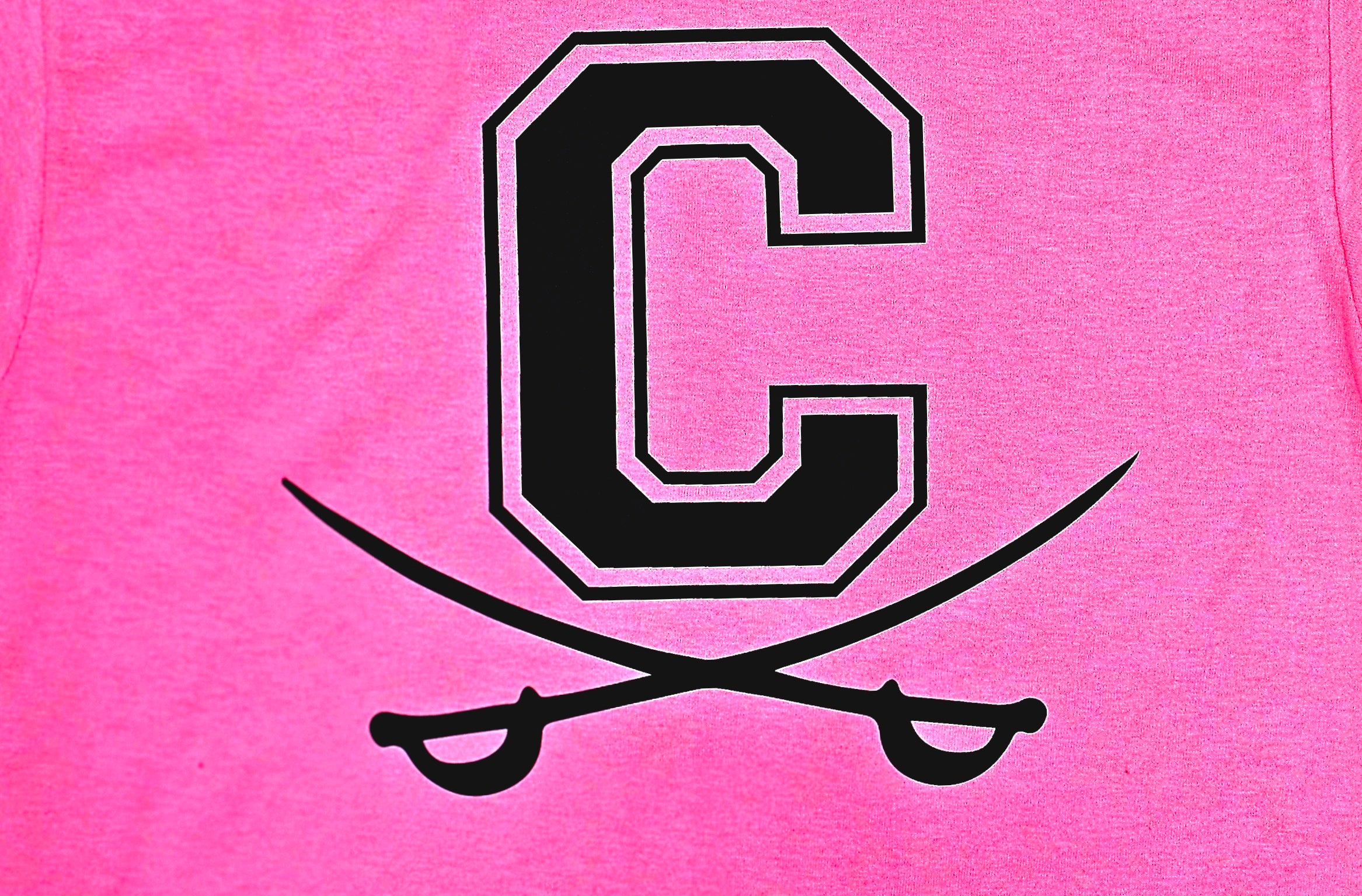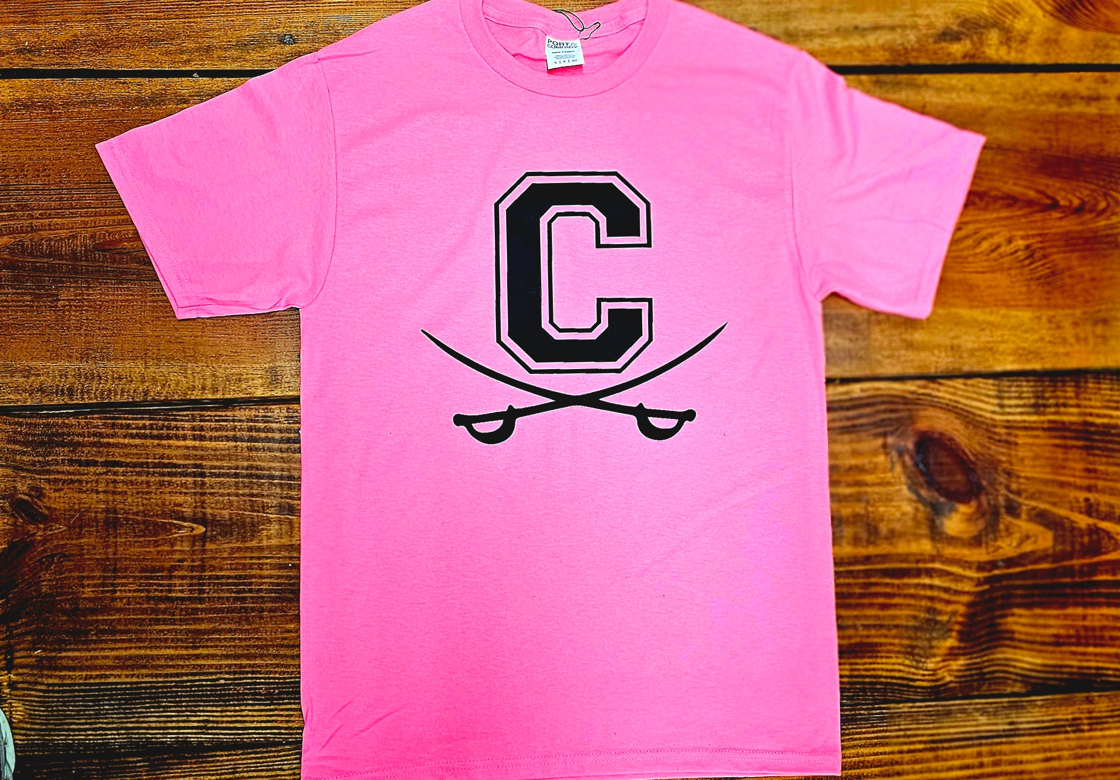 Sport your Cavs gear at the 2025 Chillicothe High School Pink Out Football Game. This T-shirt features a large black “C” logo on a bright pink colored tee so you can stand out, show up, and support breast cancer awareness month.