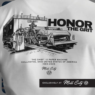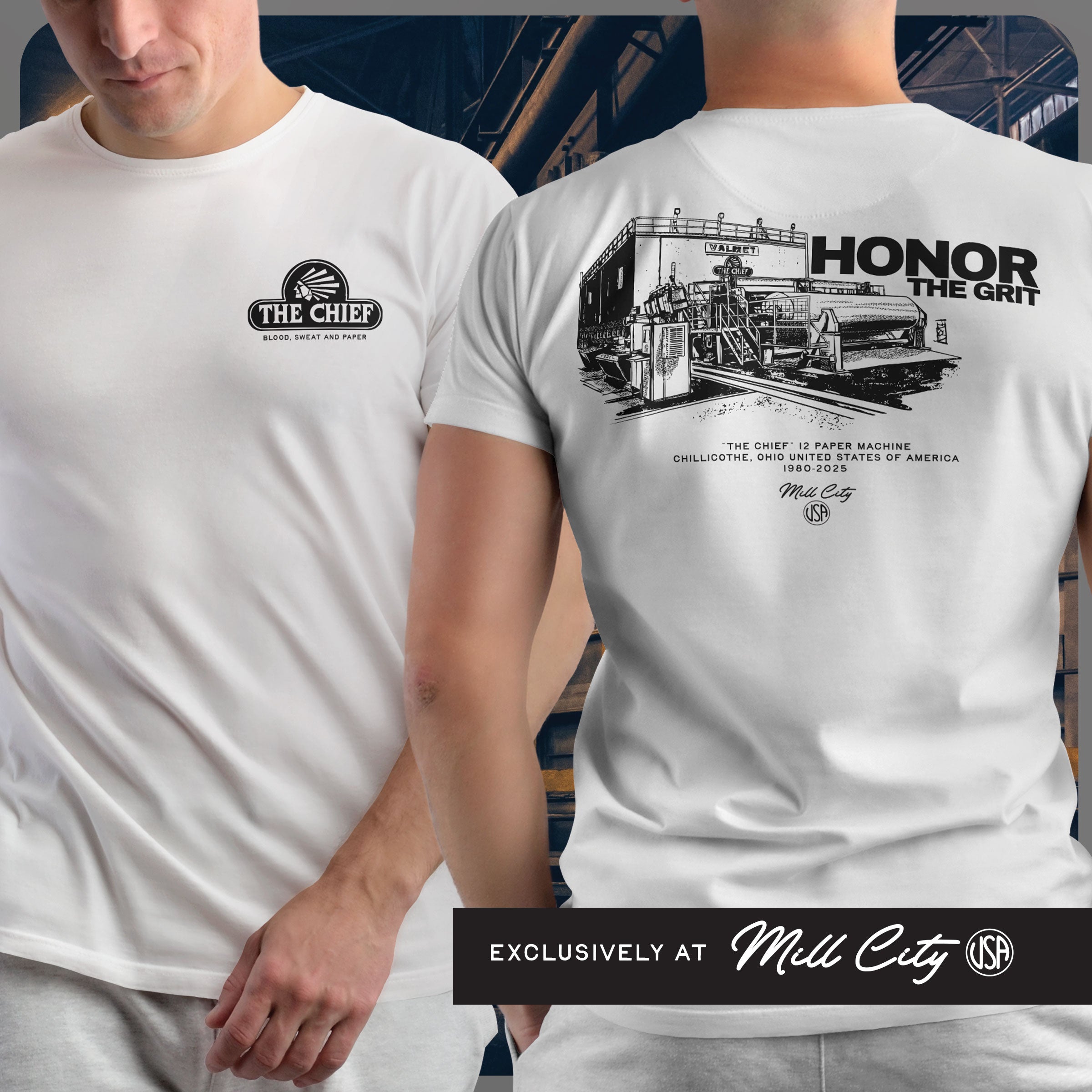 Introducing the “Chief” tee from Mill City Apparel — a tribute to Paper Machine 12, once North America’s largest. Featuring the iconic “Chief” logo on the chest and a hand drawn illustrated image of the legendary machine on the back. Gone, but never forgotten — this town was built on paper.